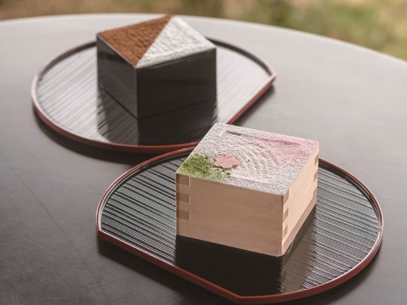 好文亭内のカフェ「樂(らく)」の人気スイーツ「桝スイーツ」とコーヒーをご堪能ください。